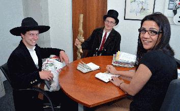 Bildzeile: Besuch mit Stenz (Wanderstock) und Bündel (Gepäck): John Christian (links) und Maik Czepl holten sich bei Landrats-Referentin Sengül Ersan den Kreis-Stempel für ihr Wanderbuch ab. Foto: B. Kalle - Kreis Unna