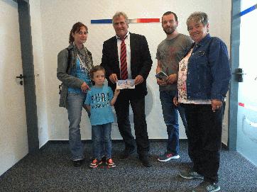Foto (Stadt Cuxhaven): Familie Huber bekommt das neue Gutscheinheft für Neubürger von Oberbürgermeister Dr. Ulrich Getsch im Bürgerbüro überreicht.