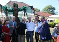 Von der überlebensgroßen und der Natur nachempfundenen Animationsfigur lassen sich beim Sommerfest des Naturparks Schwalm-Nette gerne becircen (v.r.): Verbandsvorsteher Peter Ottmann; Dr. Ferdinand Schmitz, Vorsitzender der Verbandsversammlung; Naturpark-Geschäftsführer Michael Puschmann, Christian Weisbrich, Förderverein-Vorsitzender der Biologischen Station Krickenbecker Seen; Otto Birkmann, stellvertretender Bürgermeister von Kempen; Drs. Leo Reyrink, Geschäftsführer des Naturparks Maas-Schwalm-Nette, und dessen Partnerin Sylvia Erkens. Foto: Axel Küppers / Abdruck honorarfrei