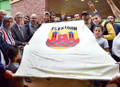 Flüchtlinge bedanken sich „Wir bedanken uns beim Bürgermeister und bei der Bevölkerung der Stadt Iserlohn“ steht auf dem Banner, mit dem die Flüchtlinge aus der Notunterkunft Almelo-Sporthalle gestern (1. September) Bürgermeister Dr. Peter Paul Ahrens überraschten. Dazu hatten sie das Wappen der Stadt Iserlohn auf das Tuch gemalt. „Das hat mich sehr berührt“, so Dr. Ahrens, der gerne den Dank stellvertretend für alle Iserlohner entgegen nahm. „Diese Geste zeigt, dass die Menschen das Engagement und die große Hilfsbereitschaft, die ihnen in unserer Stadt entgegen gebracht wurde und wird, sehr zu schätzen wissen“, so Ahrens weiter. „Wir sind sehr, sehr glücklich, in Iserlohn zu sein und möchten gerne etwas zurück geben“, begründeten die Flüchtlinge ihr Geschenk und beschrieben, dass sie auf den Stationen ihrer Flucht, eine solche Willkommenskultur wie in Iserlohn noch nicht kennen gelernt hätten. Gleichzeitig baten sie den Bürgermeister, ihnen zu helfen bei der schnellen Abwicklung ihrer Asylverfahren, bei der Familienzusammenführung und bei der kurzfristigen Erteilung einer Arbeitserlaubnis. Dr. Ahrens sagte zu, sie zu unterstützen, soweit es ihm möglich sei. Auch für Ordnungsamtsleiterin Angela Schunke, die gestern die Betreuung der Notunterkunft an die Johanniter abgab, gab es ein Geschenk. Ihr hatten die Flüchtlinge ein Bild des Iserlohner Danzturms gemalt, ebenfalls mit einem Dankeschön als Widmung versehen.