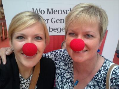 Gabriele Hoffmann, Koordinatorin Mehrgenerationenhaus Cuxhaven, traf in Berlin eine „alte“ Bekannte: Rowena Dalkner setzte sich schon als Jugendliche für die Belange im Jugendrat der Stadt Cuxhaven ein. Mittlerweile leitet sie das Mehrgenerationenhaus Hildesheim. Die roten Nasen verteilte Moderator Eckhart von Hirschhausen, der mit seiner Stiftung „Humor hilft heilen“ Partner des Kongresses war.