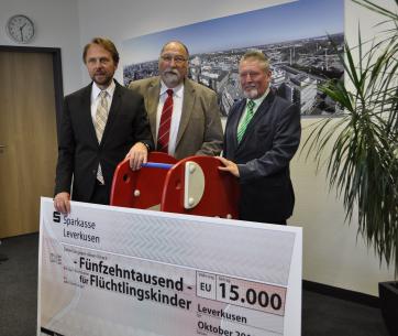 Dieter März, 1. Vorsitzender, und Geschäftsführer Manfred Kafier überreichten den Spendenscheck heute im Rahmen eines Pressetermins an Oberbürgermeister Uwe Richrath,  der dem Verein für das Engagement herzlich dankte: „Eine Spende in dieser Größenordnung ist nicht alltäglich. Sie bedeutet eine große konkrete Hilfe für Kinder, die mit ihren Eltern eine lange und gefährliche Flucht hinter sich haben. Wieder unbeschwert spielen zu können, ist sehr wichtig, um das Erlebte zu verarbeiten und sich hier gut einzuleben.“ Gemeinsam mit dem Sozialdezernat wird nun geprüft, an welchen Unterkünften das Geld investiert werden soll.