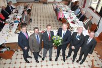 In der Dampfmaschinen-Halle des NEW-Wasserwerks Helenabrunn in Mönchengladbach fand die Verbandsversammlung des Naturparks Schwalm-Nette statt. Blumen gab es für den neugewählten Verbandsvorsteher Dr. Andreas Coenen (3.v.r.). Die ersten Gratulanten waren (v.l.) NEW-Vorstand Frank Kindervatter; Mönchengladbachs Bürgermeister Ulrich Elsen; Dr. Ferdinand Schmitz, Vorsitzender der Verbandsversammlung; Naturpark-Geschäftsführer Michael Puschmann; Peter Ottmann, Vorgänger von Dr. Coenen als Verbandsvorsteher. Foto: Axel Küppers / Abdruck honorarfrei