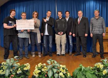 Spende an das Hospiz Mutter Teresa übergeben In Zusammenarbeit zwischen der Stadt Iserlohn und dem Berufskolleg des Märkischen Kreises ist in der Theater AG des Berufskollegs das Theaterstück “Eine pixelige Odyssee” entstanden. Unter Anleitung hatten Jugendliche eine Farce erarbeitet, in der Themen wie Spielsucht, Computer- und Onlinespiele und vieles mehr präsentiert wurden. Bei einem Pressetermin am Dienstag, 8. Dezember, im Forum des Berufskollegs des Märkischen Kreises übergaben der stellvertretende Bürgermeister Thorsten Schick, Jürgen Lensing (Jugendschutz der Stadt Iserlohn) und der Leiter des Berufskollegs Bernhard Ingelbach den symbolischen Spendenscheck an Lucyna Krzeminski (Einrichtungs- und Pflegedienstleitung Hospiz Mutter Teresa). Mit dabei waren Ralf Schlüter (Berufskolleg und Regisseur), Roman Wissenbach (Theaterpädagoge und Regisseur) sowie Schülerinnen und Schüler des Berufskollegs, die als Schauspieler beim Theaterstück mitgewirkt hatten. |