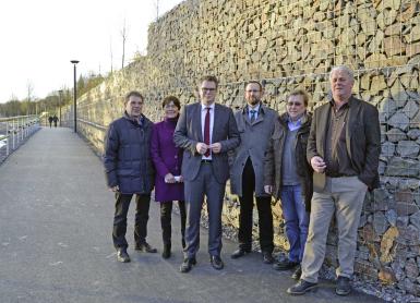 Projekt LenneSchiene: Lennepromenade und Lenneterrassen zur Benutzung freigegeben „Mit dem Bau der Lennepromenade sind wir unserem Ziel, den Fluss wieder erlebbar zu machen, ein großes Stück näher gekommen“, freute sich Bauressortleiter Mike Janke, als er am 9. Dezember die rund einen Kilometer lange Lennepromenade offiziell zur Benutzung freigab. Im Rahmen des Regionale-Projektes LenneSchiene entstanden in rund 12-monatiger Bauzeit – fünf Monate schneller als geplant - im Iserlohner Stadtteil Letmathe die Lennepromenade mit den Lenneterrassen. Fertiggestellt ist auch ein weiterer Radwegeabschnitt der „Lenneroute“. Der Fuß- und Radweg führt den Besucher von der Straße An Pater und Nonne direkt zum Ufer der Lenne in den zentralen Bereich der Lennepromenade mit Sitzstufenanlage. Von dort geht es weiter in Richtung Fußgängerbrücke Luisenstraße und der neu erbauten Lenneterrassen. Der zentrale Bereich der Lennepromenade ist der neu gestaltete Platz unterhalb der denkmalgeschützten Brücke Bahnhofsstraße, der uferseitig durch eine großzügige Sitzstufenanlage zum Wasser gefasst wird. Den Sitzstufen vorgelagert liegen Trittsteine direkt im Wasser. Dem Besucher wird so eine direkte Berührung mit dem Wasser ermöglicht. Erreichbar ist die Lennepromenade über den Fuß- und Radweg sowie über eine neue Rampe. Diese befindet sich westlich der Brücke Gennaer Straße. Das vorhandene Podest der Treppe an der Brücke wurde in den Rampenlauf eingebunden. Dort ist noch eine Stahltreppe vorgesehen, die direkt von der Bahnhofsbrücke hinunter auf die Platzfläche führen wird. Im Bereich der Fußgängerbrücke Luisenstraße wurden die Lenneterrassen errichtet. Diese bestehen aus dreimal drei Sitzstufen und einer Platzfläche am Wasser. Die Lenneterrassen bilden das westliche Ende der Promenade. An dieser Stelle sowie im Bereich der Fußgängerbrücke Bahnhofsstraße / Parkplatz Woolworth wird im nächsten Jahr mit dem Bau der so genannten Stadtspangen begonnen, mit denen die Promenade an die Innenstadt Letmathes angeschlossen wird. Die Baukosten betragen bisher insgesamt drei Millionen Euro. Die Refinanzierung erfolgt zu achtzig Prozent aus Mitteln der Städtebauförderung und durch Fördermittel des Kommunalen Straßen- und Radwegebaus. Auch wenn noch nicht alle Bautätigkeiten abgeschlossen sind – zum Beispiel wird der Bau der Stahltreppe erst nach dem Winter erfolgen – steht einer Benutzung der Lennepromenade, der Lenneterrassen und des Fuß- und Radweges nichts entgegen. Aus diesem Grund konnten sie bereits zur Nutzung freigegeben werden. Die offizielle Einweihung ist dann für das kommende Frühjahr am 21. Mai geplant. Ansprechpartnerin für die Baumaßnahme im Iserlohner Rathaus ist Lisa Kaatze von der Abteilung Stadtentwicklung und Freiraumplanung, Telefon 02371 / 217-2442, E-Mail: lisa.kaatze@iserlohn.de |