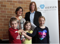In diesem Jahr haben sich 21 Schulen am Sportabzeichen-Wettbewerb beteiligt. Über 1706 Schüler schafften ein Abzeichen. Die erfolgreichsten elf Schulen wurden zur Siegerehrung in das Forum am Kreishaus eingeladen. Ganz vorne landete die Astrid-Lindgren-Schule Willich vor der Städtischen Katholischen Grundschule Wiesenstraße Kempen und der Gemeinschaftsgrundschule Vorst Amselstraße. Beste Förderschule war die Franziskusschule Süchteln. Als Belohnung erhalten die teilnehmenden Schulen Geldpreise im Wert von 50 bis 150 Euro. Das Siegerteam der Astrid-Lindgren-Schule Willich darf sich zudem über den Gewinn des Rolf-Richter-Wanderpokals freuen, den die Schüler Leandro, Vera und Carla stellvertretend entgegennahmen. Nach drei siegreichen Jahren in Folge, dürfen sie ihn behalten.