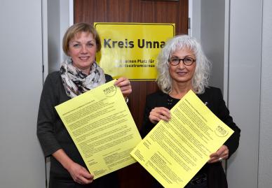 Bildzeile: Laden haupt- und ehrenamtliche Helfer zur Info-Veranstaltung ein: Heidi Bierkämper-Braun (l.) und Sevgi Kahraman-Brust. Foto: B. Kalle – Kreis Unna