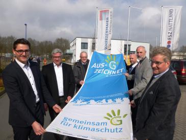 Bildzeile: Ludwig Holzbeck (2.v.r.) überreichte Dominik und Egon Schrezenmaier (v.l.) sowie Nattland-Geschäftsführer Hartmut Brückner (r.) die Klimaschutzflagge. Foto: M. Gluth – Kreis Unna