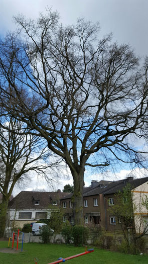 Bei der heutigen Kontrolle ist im Bereich des Spielplatzes an der Franzstraße in Langenbochum eine über hundert Jahre alte Eiche aufgefallen. Ein langer Riss zog sich durch die Baumkrone. Nach eingehender Untersuchung durch den städtischen Baumsachverständigen Lars Kuhnt stand fest: Der Baum ist nicht mehr zu retten. „Hier mussten wir sofort handeln, denn die Krone könnte brechen und auf den angrenzenden Spielplatz oder die Fahrbahn fallen“, erklärt Lars Kuhnt.