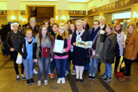 Annette Schavan (Mitte), Vorsitzende der Stiftung Bibel und Kultur, gratuliert den Schülerinnen und Schülern des Berufskollegs Viersen und den beiden Lehrerinnen Meike Morjan (r.) und Christina Kauffmann (4.v.r.) zu ihrem Erfolg beim Bibelwettbewerb "Selfie von Gott".