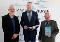 Die beiden Autoren Alfred Knorr (links) und Heinrich Lennackers (rechts) überreichen Landrat Dr. Andreas Coenen ein Exemplar ihres Buches "Geschichte der Katholischen Volksschule in Mülhausen".
