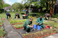 Gemeinsam bereiten die Jugendlichen die Grün- und Pflanzenflächen für den Staudenverkauf am 24. und 25. Juni in der Jugendwerkstatt vor.