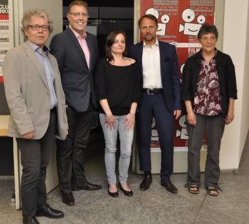 Reiner Ernst Ohle, Kinoreferent der Bayer Kultur und Bayer-Kultur-Leiter Thomas Helfrich, stellten zusammen mit Oberbürgermeister Uwe Richrath und Ute Mader sowie Barbara Brzozka (v.l.) vom Kommunalen Kino das Projekt "Willkommen im Kino" vor.