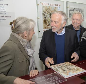 Bildzeile 1: Rolf Escher signiert einen Katalog für Ingrid und Dr. Hans Wille. Foto: Kreis Unna