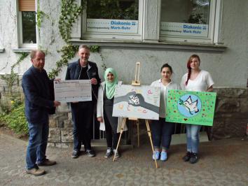 Schüler der Realschule Am Bömberg unterstützen die Flüchtlingsberatung Iserlohn der Diakonie Mark-Ruhr Schon vor den Osterferien engagierten sich zahlreiche Schülerinnen und Schüler der Realschule Am Bömberg bei dem Schulprojekt „Bild für die Flüchtlinge“. Mit diesem Projekt, das auch mit einer Spendenaktion verbunden war, soll ein Zeichen der Hoffnung und der Willkommenskultur gesetzt und die Arbeit der Einrichtungen, die sich in der Flüchtlingshilfe engagieren, gewürdigt werden. Mit Unterstützung von Kunstlehrerin Sarah Wilhelm und in Zusammenarbeit mit SV-Lehrerin Janine Borowski und dem städtischen Schulsozialarbeiter Jörg Simon wurden auf den von den Schülerinnen Ebru Yilmaz, Melina Müller und Hayat El Fechtali entworfenen Bildern zahlreiche Willkommensbotschaften malerisch dargestellt. Gegen einen Beitrag von einem Euro konnten danach alle spendenwilligen Schüler und Lehrer der Bömberg-Realschule entweder ihren Namen oder ihren „Fingerabdruck“ auf eines der Bilder setzen. Über hundert Schülerinnen, Schüler und Lehrer der Realschule beteiligten sich an der Aktion. Bei der Auswahl, an wen die die Spende gehen sollte, hat sich die Realschule Am Bömberg für die Flüchtlingsberatung der Diakonie Mark-Ruhr in Iserlohn entschieden. Am Mittwoch, 18. Mai, übergaben die drei Schülerinnen gemeinsam mit Jörg Simon die Bilder und eine Spendensumme von 115 Euro an Jens Keienburg bei der Flüchtlingsberatung an der Piepenstockstraße. Bei ihrem Besuch informierten sie sich noch ausführlicher über die Arbeit der Einrichtung und hoffen nun auf eine positive Resonanz zu den ausgestellten Bildern. |