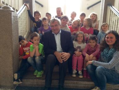 OB Getsch begrüßte die Vorschulkinder der Kita St. Marien und deren Erzieherinnen im Rathaus.