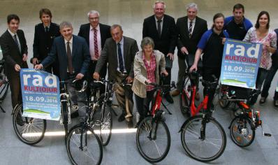 Bildzeile: Werbung für die radKULT(O)UR machen unter anderem Dr. Uli Paetzel, Vorstandsvorsitzender des Lippeverbandes (l.), Landrat Michael Makiolla (3.v.l.) und die Spitzen der beteiligten Kommunen. Foto: G. Klumpp