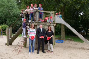 Verkehrssicherheit beginnt bei den Kleinsten: Mit der Einschulung nehmen hunderttausende Kinder in Deutschland aktiv am Straßenverkehr teil. Damit sie auch in Herten sicher unterwegs sind, verteilten Carsten Debler von der Dekra und die zweite stellvertretende Bürgermeisterin Silvia Godde knallrote Kappen mit Reflektoren. Stellvertretend für alle neuen Hertener Erstklässlerinnen und -klässler besuchten sie heute den Kindergarten Pusteblume in Süd.