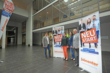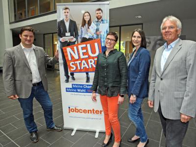 | Laden ein zur ersten kreisweiten Qualifizierungsmesse am 10. und 11. August im Max-Born-Berufskolleg in Recklinghausen (v.r.): Jürgen Ritzka, Leiter Jobcenter Kreis Recklinghausen, die Mitarbeiterinnen Bettina Witzke und Nora Janzen sowie Patrick Hundt, Fachdienstleiter Markt und Integration. Foto: Jobcenter Kreis Recklinghausen |