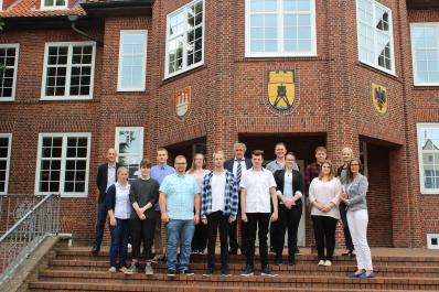 Neun Auszubildende und Anwärterinnen begannen in diesem Jahr mit der Ausbildung bei der Stadt Cuxhaven. Oberbürgermeister Dr. Ulrich Getsch begrüßte Anfang August im Rathaus. Auch hieß Claudia Trumbach (Fachbereichsleiterin Verwaltungsdienste) die Neuankömmlinge willkommen. Neben Informationen rund um die Ausbildung, die Andreas Boy als zuständiger Sachbearbeiter für die Ausbildung der Nachwuchskräfte gab, gehörte auch eine Führung durch die Abteilungen der Stadtverwaltung zu diesem Tag. Zusammen mit Patrick Wolter, Christoph Wilkens und Kathrin Blohm  von der städtischen Jugend- und Auszubildendenvertretung, konnten die Nachwuchskräfte einen ersten Einblick in die verschiedenen Tätigkeitsfelder bekommen. Die Berufsfeuerwehr zeigte ihnen die Einsatzfahrzeuge, den Trockenturm für die Schläuche und die Einsatzzentrale. Aber auch andere städtische Einrichtungen wurden kurz vorgestellt, wie zum Beispiel der Bauhof, die Stadtbibliothek und das Wattenmeer-Besucherzentrum. Neben den vielen neuen Eindrücken und Informationen rund um den neuen Arbeitsplatz konnten auch erste Kontakte geknüpft werden. Zudem standen frisch Ausgelernte mit Tipps und Erfahrungen für viele Fragen zur Verfügung.