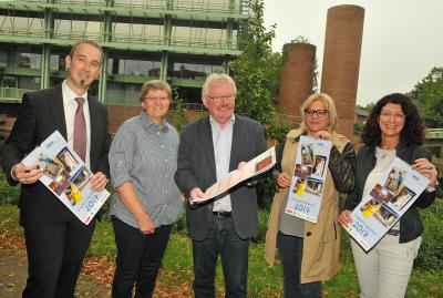 Ordnung im familiären Alltag: Kai Enck von der Stadtsparkasse Bocholt, Gudrun Vöing vom Kinderschutzbund, Bürgermeister Peter Nebelo, Martina Tefert (Kinderschutzbund) und Sigrid Hobbold (Fachbereich Jugend, Familie, Schule und Sport) v.l.n.r. präsentieren den neuen Familienplaner des Kinderschutzbundes für 2017 - Foto: Bruno Wansing, Stadt Bocholt