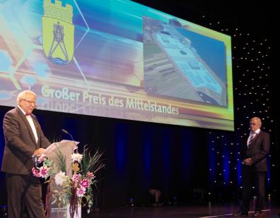 Die Oskar-Patzelt-Stiftung würdigt bundesweit hervorragende Leistungen mittelständischer Unternehmen sowie mittelstandsfreundlicher Kommunen und Banken und verleiht jährlich den Wirtschaftspreis „Großer Preis des Mittelstandes”. Die Stadt Cuxhaven erhielt am vergangenen Samstag den Sonderpreis „Kommune des Jahres".Mit dem Sonderpreis werden die verschiedenen Aktivitäten, Projekte und Initiativen von Kommunen für den Aufbau und bei der Entwicklung mittelständischer Wirtschaftsstrukturen gewürdigt. Die diesjährige Auszeichnungsgala fand im Rahmen des 22. Wettbewerbs um den „Großen Preis des Mittelstandes 2016“ für die Wettbewerbsregionen Niedersachsen/Bremen, Nordrhein-Westfalen, Rheinland-Pfalz/Saarland und Schleswig-Holstein/Hamburg im Düsseldorfer Hotel Maritim mit mehr als 500 Unternehmerinnen und Unternehmer sowie zahlreichen, geladenen Gästen statt. Mit dabei: Cuxhavens Oberbürgermeister Dr. Ulrich Getsch und Erste Stadträtin Andrea Pospich, die überglücklich den Sonderpreis „Kommune des Jahres“ für die Stadt Cuxhaven mit an die Küste nehmen durften. „Dieser Preis ist ein deutliches Signal der Anerkennung der gemeinsamen Bemühungen für unsere Stadt und diesen Standort. Er ist zugleich ein Ergebnis der fruchtbaren Zusammenarbeit von Politik und Verwaltung“, betont Getsch. „Wir sind sehr stolz, dass diese Arbeit nach der erfolgreichen Ansiedlung von Siemens und der wichtigen Entschuldungshilfe des Landes mit dem Preis gewürdigt wird. Der Weg dorthin war langwierig und nicht immer einfach. Umso schöner, dass auch die Juroren und der Vorstand der Oskar-Patzelt-Stiftung unser Tun mit dieser begehrten Auszeichnung belohnen“, ergänzt Pospich.