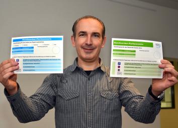 Bildzeile: Michael Arnold aus der Straßenverkehrsbehörde des Kreises Unna zeigt die neuen Handwerker-Parkausweise. Foto: Birgit Kalle – Kreis Unna