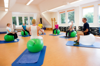 Kursteilnehmer bei einer gemeinsamen Übung mit Gymnastik-Bällen. Ab Februar 2017 bietet der KreisSportBund Viersen eine Übungsleiterausbildung zum Thema "Sport in der Rehabilitation mit Schwerpunkt Orthopädie" an.
