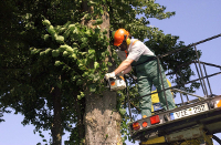 Ein Mitarbeiter des Baubetriebshofs des Kreises Viersen führt Baumschnittarbeiten durch.