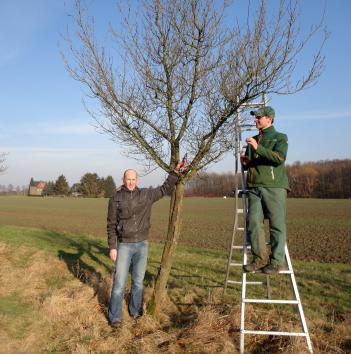 Bildzeile: Hartmut A. Kemper (links) vom Kreis Unna zeigt Landschaftsgärtner Sebastian Schlierkamp den richtigen Schnitt. Foto: T. Hallmann – Rechte Kreis Unna