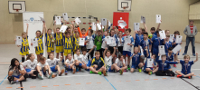 Stolz präsentieren die Teilnehmer des Handball-Turniers ihre Urkunden, Medaillen und Pokale.