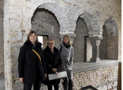Innen ist es deutlich zu sehen: Der Putz ist abgeschlagen und Verkleidungen entfernt. Zum Vorschein kamen Rundbögen und Ständerbauweise. Viele dieser historischen Details wie etwa die Türlaibungen und Bögen oberhalb der Türen, sollen erhalten bleiben. Das zurzeit freiliegende Ziegelmauerwerk wird jedoch wieder verputzt. Schließlich wird in dem historischen Gebäude eine moderne Haustechnik installiert. Das bedeutet, viele Leitungen für Datenkommunikation, Elektrik und Heizung, die gezogen und wieder unter Putz gelegt werden.