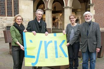 Programm Lyrikertreffen (v.l.): Frauke Schnell, Leiterin des städtischen Kulturamtes, Verleger Josef Kleinheinrich, Kulturdezernentin Cornelia Wilkens und Hermann Wallmann, Künstlerischer Leiter, stellen das Programm für das Lyrikertreffen vom 19. bis 21. Mai vor. Foto: Presseamt Münster. Veröffentlichung mit dieser Pressemitteilung honorarfrei.