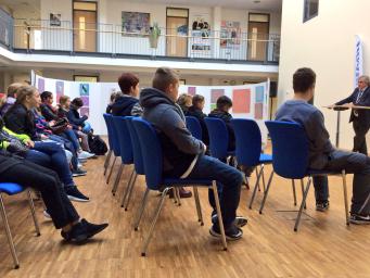 • „Denken oder dösen?“: Oberbürgermeister Dr. Ulrich Getsch bei der Begrüßung der Schülerinnen und Schüler in der Bürgerhalle