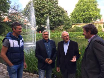 Zufriedene Gesichter: Dezernatsleiter Martin Adamski und Andre Mietzke (stellvertretender Abteilungsleiter) danken den Spendern Henning Hoops und Dr. Ulrich Getsch für den Erhalt des Wasserspiels am Lichtenbergplatz.