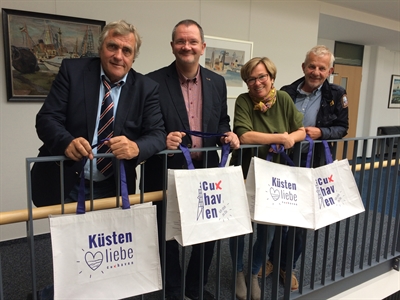 Tragbar: Oberbürgermeister Dr. Ulrich Getsch, Wolf-Dieter Schink, Beatrice Lohmann und Burkhard Schmidt (Verkehrsverein Duhnen) mit den neuen „Küstenliebe“-Tragetaschen, die ab sofort zu erwerben sind.
