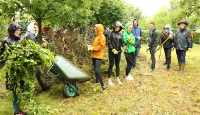 Dabei sind die Rahmenbedingungen alles andere als einladend: Es regnet Bindfäden. Dennoch packen die 17- und 18-Jährigen beherzt mit an. „Zu tun gibt es reichlich“, sagt Werner Dobbek, Leiter des Naturparkzentrums in Wachtendonk. Der Eichen-Schnitt der Hecke muss auf den Haufen für den Häcksler. Ebenso die Gehölze vom Obstbaumschnitt im Frühjahr. Das Heu kommt auf den Kompost. Und ab und an muss auch ein Frosch oder eine Kröte von den Schülern gerettet werden. „Alle haben sehr gut mitgemacht und bestimmt auch etwas über die heimische Natur mitgenommen“, so das Fazit von Puschmann.
