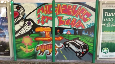 Graffiti-Aktion an der MVB-Haltestelle "Neustädter See"