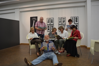 Spaß an der Improvisation ist eines der Markenzeichen der Laientheatergruppe Drama-Ticker Leverkusen. Das Ensemble präsentiert immer wieder mit großem Erfolg interaktives Vorlese-Theater und begeistert damit das Publikum. Selbst das Vorlesen von Einträgen aus dem Telefonbuch kann dabei zu einem besonderen Erlebnis und gelungenen Kulturabend werden. Die Laientheatergruppe ist seit einigen Jahren auch fester Bestandteil des Programms der Buchwoche „Levliest.“ Am 25. April diesen Jahres stellte das Ensemble sein Improvisationstalent im K 1 in Leverkusen-Wiesdorf unter Beweis. Auf den Verkauf von Eintrittskarten wurde dabei verzichtet. Stattdessen wurde um Spenden gebeten, mit denen neue Bücher für die Leverkusener Vorlesepaten und Mentoren gekauft werden sollten. Bei einem Treffen in der Leverkusener Stadtbibliothek in der vergangenen Woche wurden zehn neue Bücher nun an Carolin Maus, Fachbereichsleiterin Schulen, Eva- Marie Urban, Leiterin der Stadtbibliothek, und Christiane Rehlinghaus vom Kommunalen Bildungsbüro Leverkusen übergeben. Wer aber geglaubt hätte, dies würde in Form des klassischen Überreichens mit „Shake-Hands“ geschehen, sah sich getäuscht. Flugs wurden Möbel gerückt, Bücher verteilt und eine kleine „Spielfläche“ in der Stadtbibliothek geschaffen. Die Empfänger der Bücher wurden sofort mit einbezogen und mit den neuen Kinderbüchern wurde eine interaktive Vorlese-Situation geschaffen, an der alle sichtlich Freude hatten.
