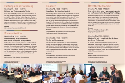 Folgende Workshops werden angeboten: Haftung und Versicherung sowie Grundlagen der Gemeinnützigkeit, Beginn jeweils um 17 Uhr, Kommunikation im Vereinsleben sowie Vereine und Umsatzsteuer, Beginn jeweils um 19 Uhr.