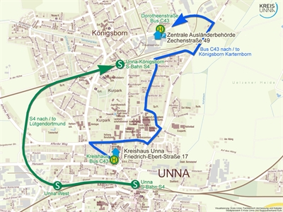Wer nach dem 17. Januar am Kreishaus landet und die Ausländerbehörde sucht, den bringt zum Beispiel der Bus C43 vom Kreishaus zur Haltestelle Dorotheenstraße, direkt gegenüber der Ausländerbehörde. Auch der Bahnhof Königsborn ist nur 900 Meter weit entfernt. Die S4 bringt Besucher vom Hauptbahnhof Unna direkt dorthin. PK | PKU