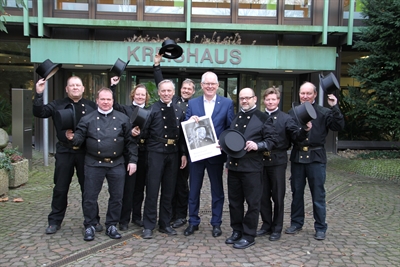 Schornsteinfeger bringen bekanntlich Glück – umso mehr freute sich Landrat Cay Süberkrüb zum Jahresbeginn über den Besuch von einer Schornsteinfegerin und sieben Schornsteinfegern aus dem Kreis Recklinghausen. In traditioneller schwarzer Kleidung und mit Zylinderhut überbrachten sie ihre Neujahrswünsche im Kreishaus.