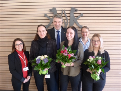 V.l.n.r.: Carmela Senatore (Personalrat), Kira Löhne, Erster Kreisrat Henning Heiß, Nadine Bewig, Nicole Papenberg (Ausbildungsleitung) und Larissa Lyzio