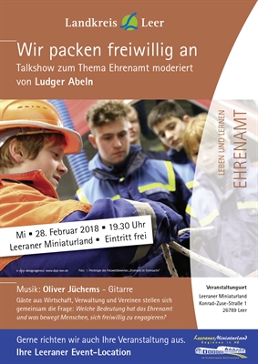 Ludger Abeln geht diesen Fragen nach und diskutiert mit Gästen aus Wirtschaft, Verwaltung und Vereinen in einer Talkshow zum Thema Ehrenamt am 28. Februar um 19.30 Uhr im Leeraner Miniaturland, Konrad-Zuse-Straße 1 in Leer.