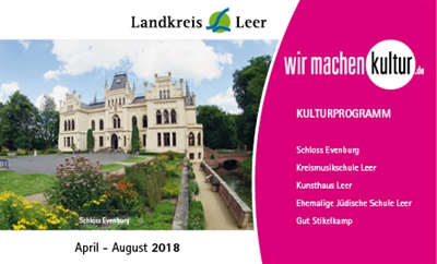 Neben den aktuellen Ausstellungen der Ehemaligen Jüdischen Schule Leer und des Kunsthauses Leer werden im Kulturkalender auch die beliebten Zeitreisen des Schlosses Evenburg, der traditionelle Waldgottesdienst auf Gut Stikelkamp, das neue Sommerfest im Schulgarten der Ehemaligen Jüdischen Schule Leer wie auch das Schülerforum in der Kreismusikschule aufgeführt. Im praktischen Format für die Handtasche und entfaltet groß wie ein Plakat finden sich noch viele weitere kreative Angebote für Kinder und Erwachsene.