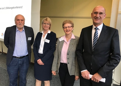 Professor Waldemar Stange (Institut Sozialarbeit und Sozialpädagogik, Leuphana Universität Lüneburg), Jennifer Wimmer (Leiterin Bildungsbüro), Maria Zerhusen (Leiterin Berufsbildende Schulen Peine) und Landrat Franz Einhaus bei der zweiten Bildungskonferenz der Bildungsregion Landkreis Peine