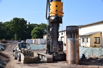 Anfang Juli wurde das Großlochbohrgerät angeliefert und aufgebaut. Inzwischen haben die Bohrungen auf dem Areal begonnen. Das Gerät bohrt in der Baugrube bis in eine Tiefe von vier bis sieben Metern den kontaminierten Boden aus. Der Bohrdurchmesser beträgt zwei Meter, insgesamt werden leicht überschnitten rund 300 Bohrungen durchgeführt.