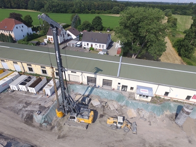 Zunächst wurde auf dem Gelände vor einer Betriebshalle eine Baugrube von rund 1000 m² Grundfläche und bis etwa 2,5 Meter Tiefe ausgehoben. In dieser Baugrube findet der tiefe Bodenaustausch durch das sogenannte Großlochbohrverfahren statt.