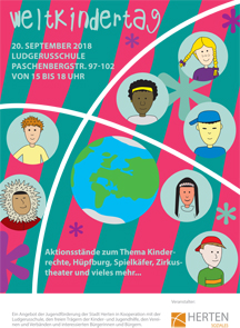 Egal ob in Kitas, Schulen oder Gemeinden – in ganz Deutschland bekommen Kinder einen tollen Tag mit vielen Veranstaltungen geliefert. In Herten feiern alle zusammen den Weltkindertag. Mit Aktionsständen zum Thema „Kinderrechte“, einer Hüpfburg, einem Bewegungsparcours, dem Zirkustheater StandArt und vielem mehr lädt die Jugendförderung alle Kinder zu einem großen Fest ein.