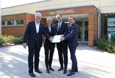 | Freuen sich gemeinsam über die Förderungen (v.l.): Landrat Cay Süberkrüb, Regierungspräsidentin Dorothee Feller, Prof. Dr. Bernd Kriegesmann (Präsident Westf. Hochschule) und Thomas Wessel (Hochschulratsvorsitzenden der Westf. Hochschule). |